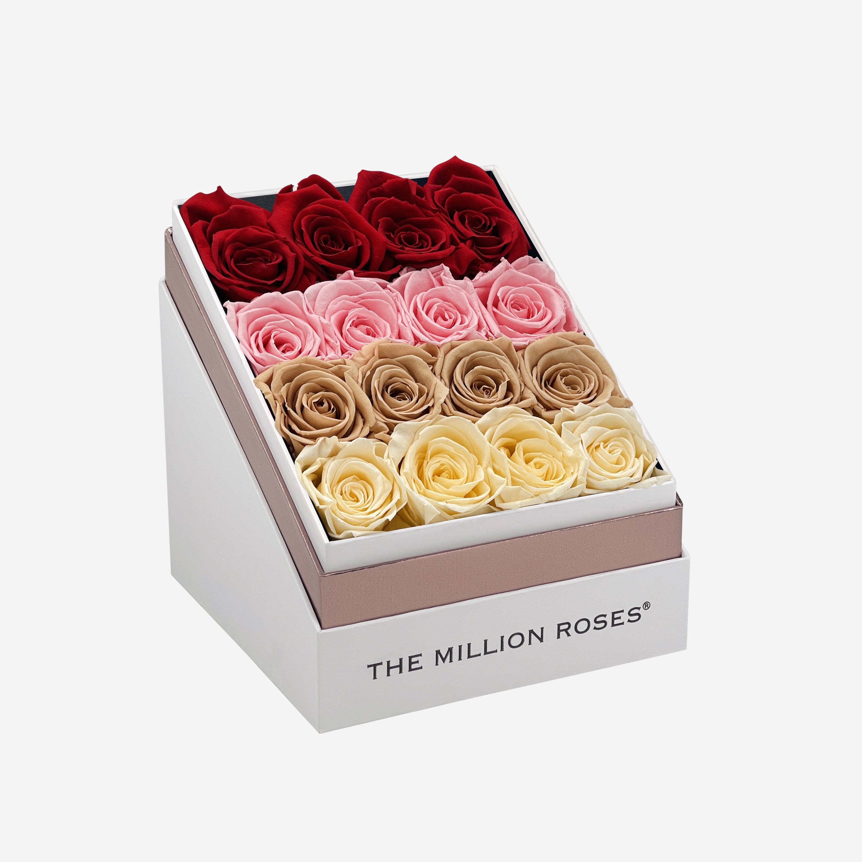 La colección Million Roses Fade presenta nuestras rosas prístinas para siempre en una exhibición única y en cascada. Dispuestos en un cautivador patrón ombre que se desvanece de un tono a otro, hay cuatro colores impresionantes presentados en estas elegantes cajas inclinadas. Opte por un arreglo monocromático de rosas preservadas que siga un degradado de claro a oscuro, o elija una exhibición pastel multicolor clara. Tal vez prefiera la combinación de colores complementarios o disfrute de una selección neutra de rosas de lujo. Descubre la colección Fade para encontrar tu caja de rosas de cuatro colores a continuación.