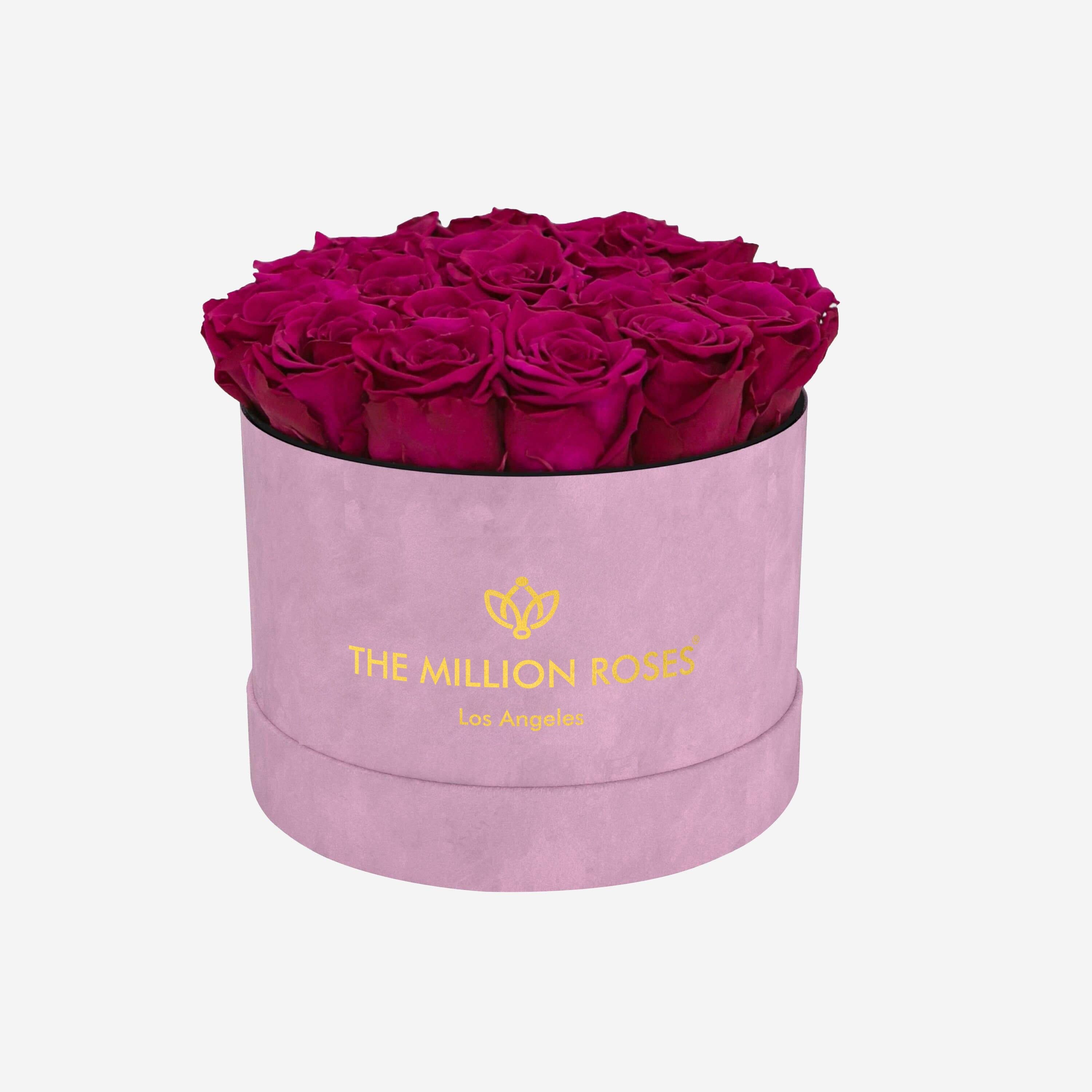Nuestra colección Classic encarna esta elegante simplicidad en una caja de gamuza rosa claro llena de rosas magenta de larga duración.