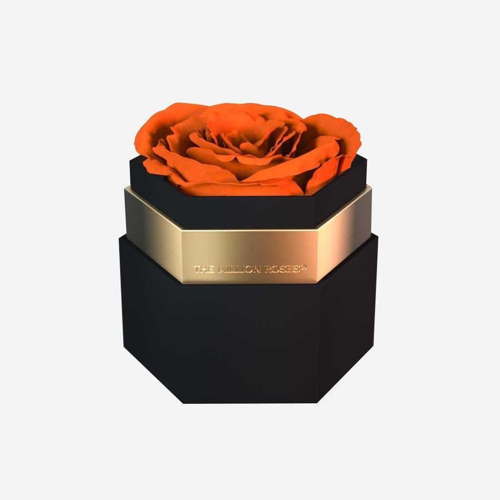 Esta rosa naranja en una caja negra única en forma de hexágono le da un nuevo giro a nuestro aspecto clásico. El diseño geográfico agrega un toque de modernidad a su oficina o dormitorio mientras mantiene la suavidad de un arreglo floral.
