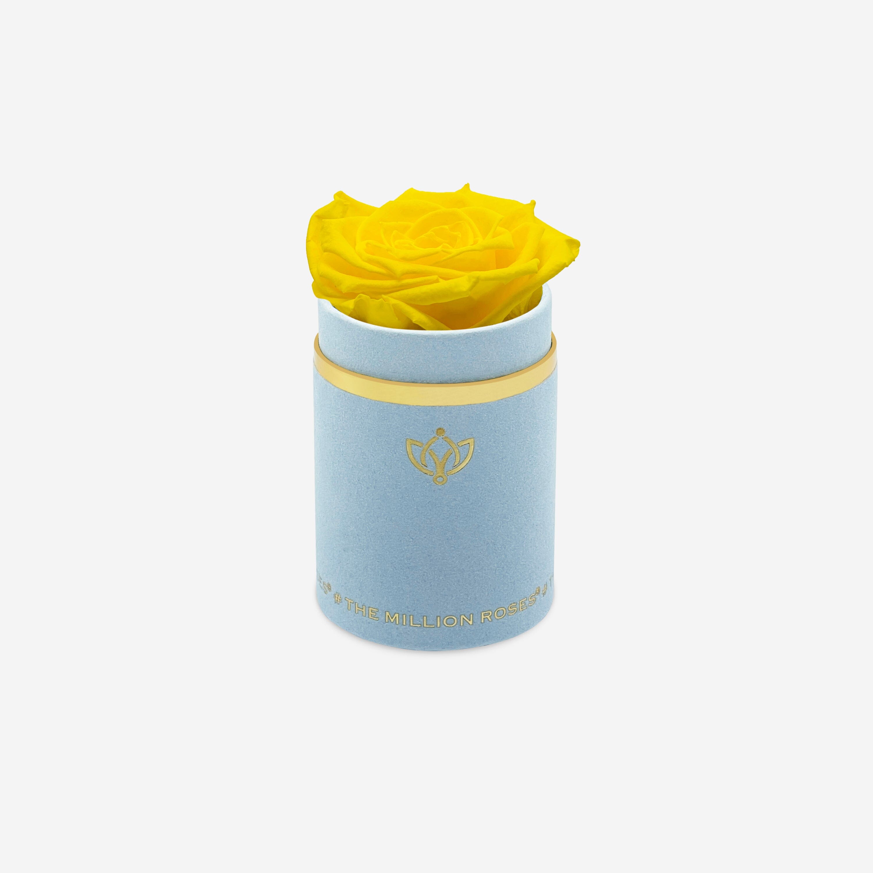 Una rosa lo dice todo en esta caja de gamuza azul claro adornada con una hermosa y duradera rosa amarilla.