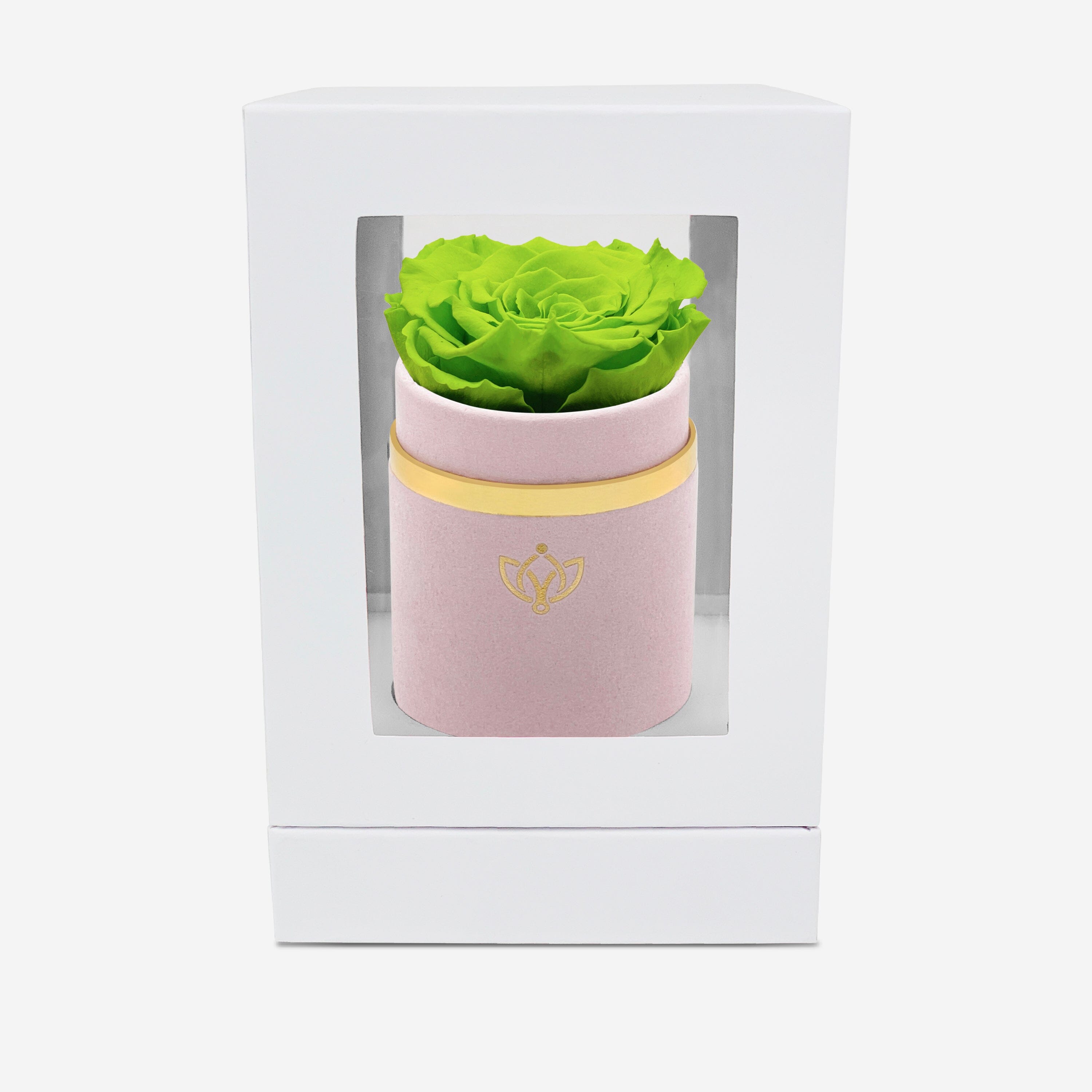 Una rosa lo dice todo en esta caja de gamuza rosa claro adornada con una hermosa y duradera rosa verde claro.