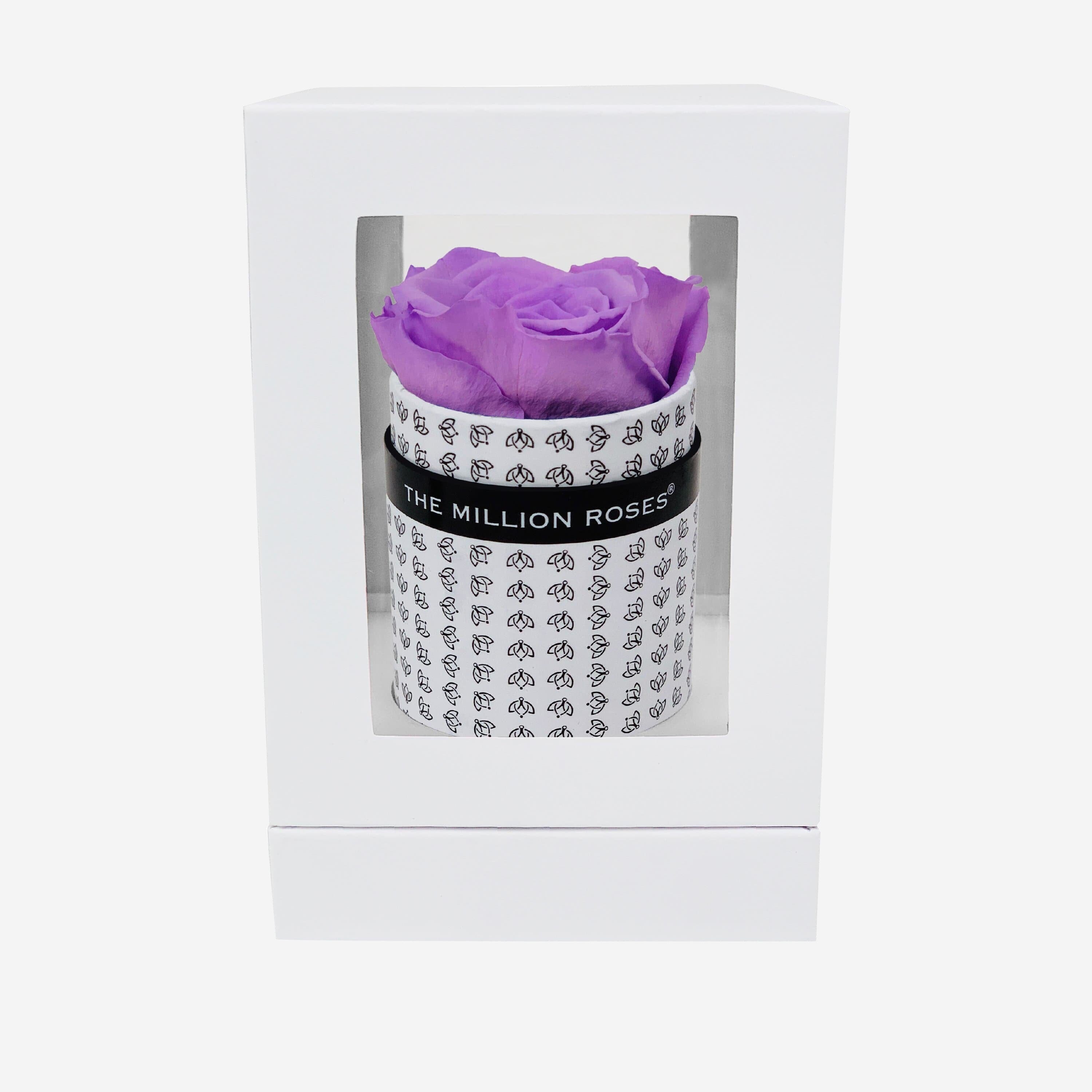 Una rosa lo dice todo en esta caja blanca adornada con una hermosa y duradera rosa lavanda.