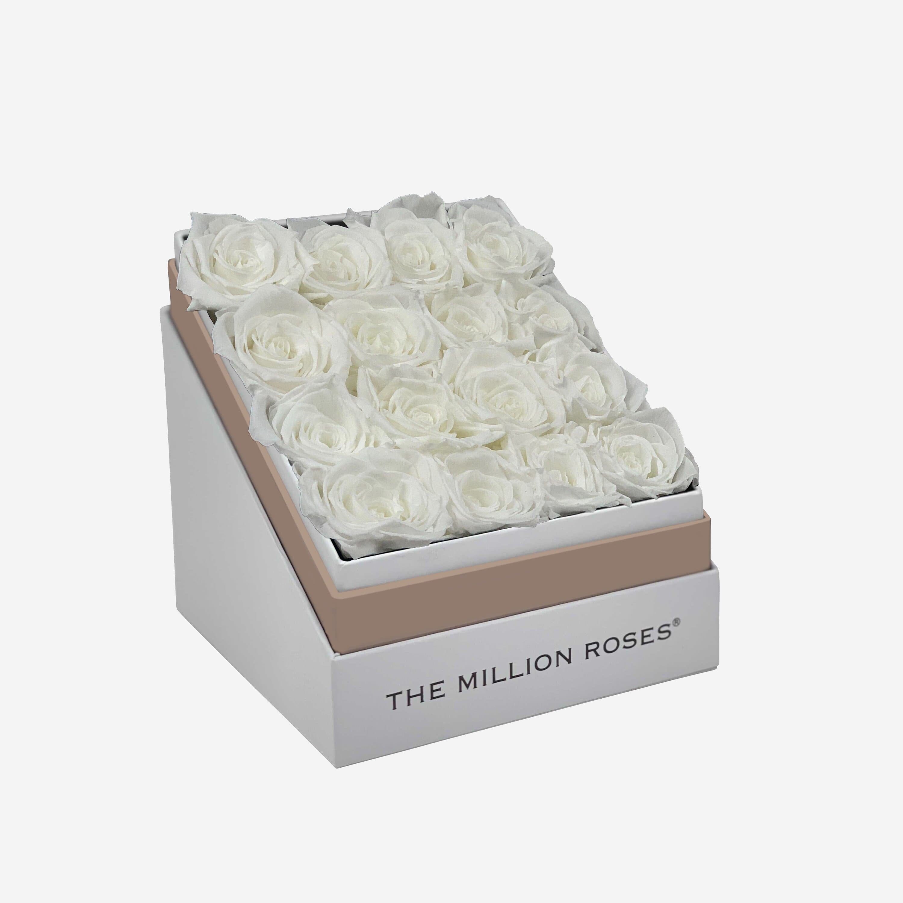 Nuestra colección Square adquiere un aspecto completamente nuevo en esta caja blanca única llena de rosas blancas.