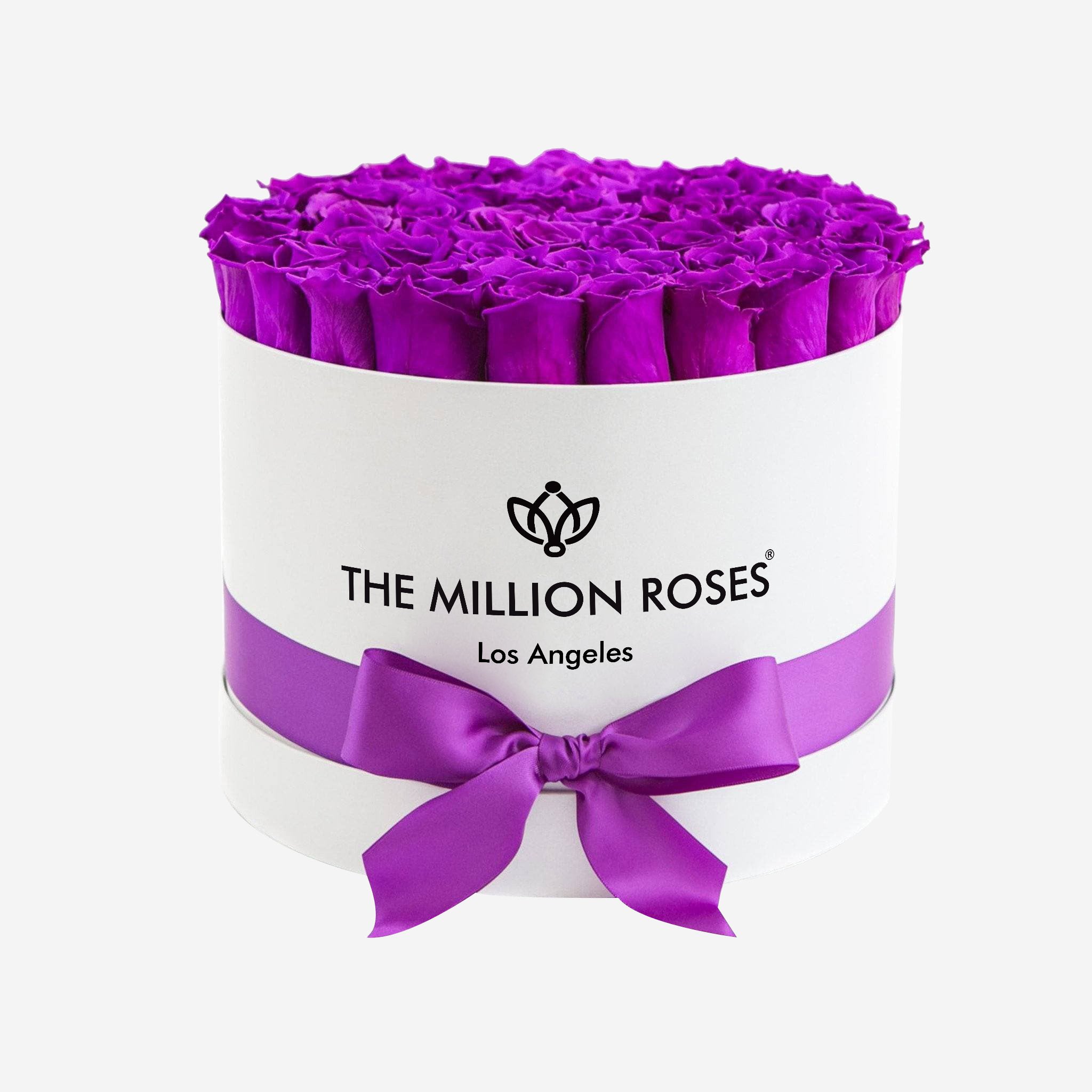 El arreglo muestra rosas preservadas de color púrpura con una apariencia natural excepcional en una de nuestras increíbles cajas blancas hechas a mano.
