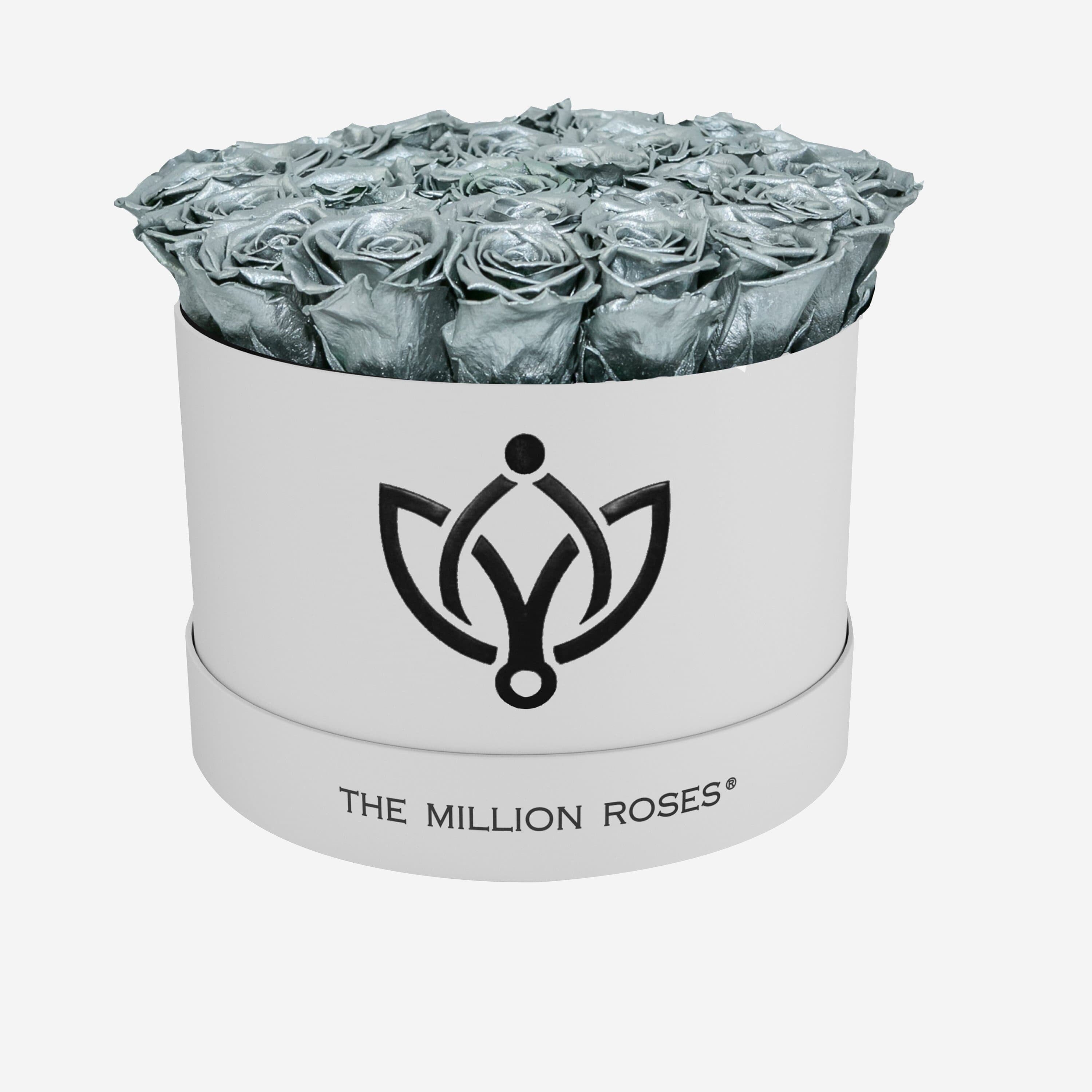 El arreglo muestra rosas preservadas de plata con una apariencia natural sobresaliente en una de nuestras increíbles cajas blancas hechas a mano.