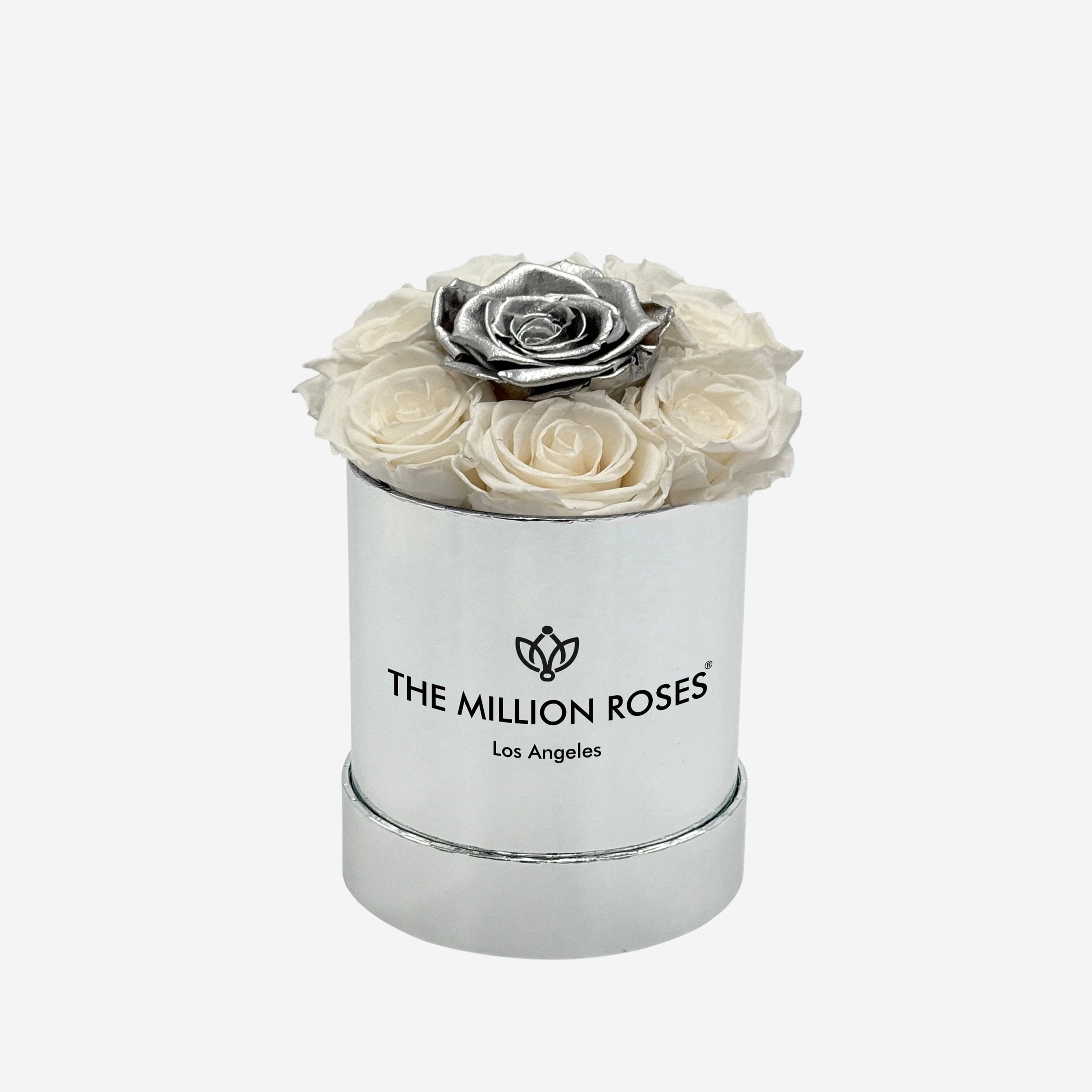 The hand-crafted mirror silver box in our signature Basic arrangement showcases white and silver preserved roses.