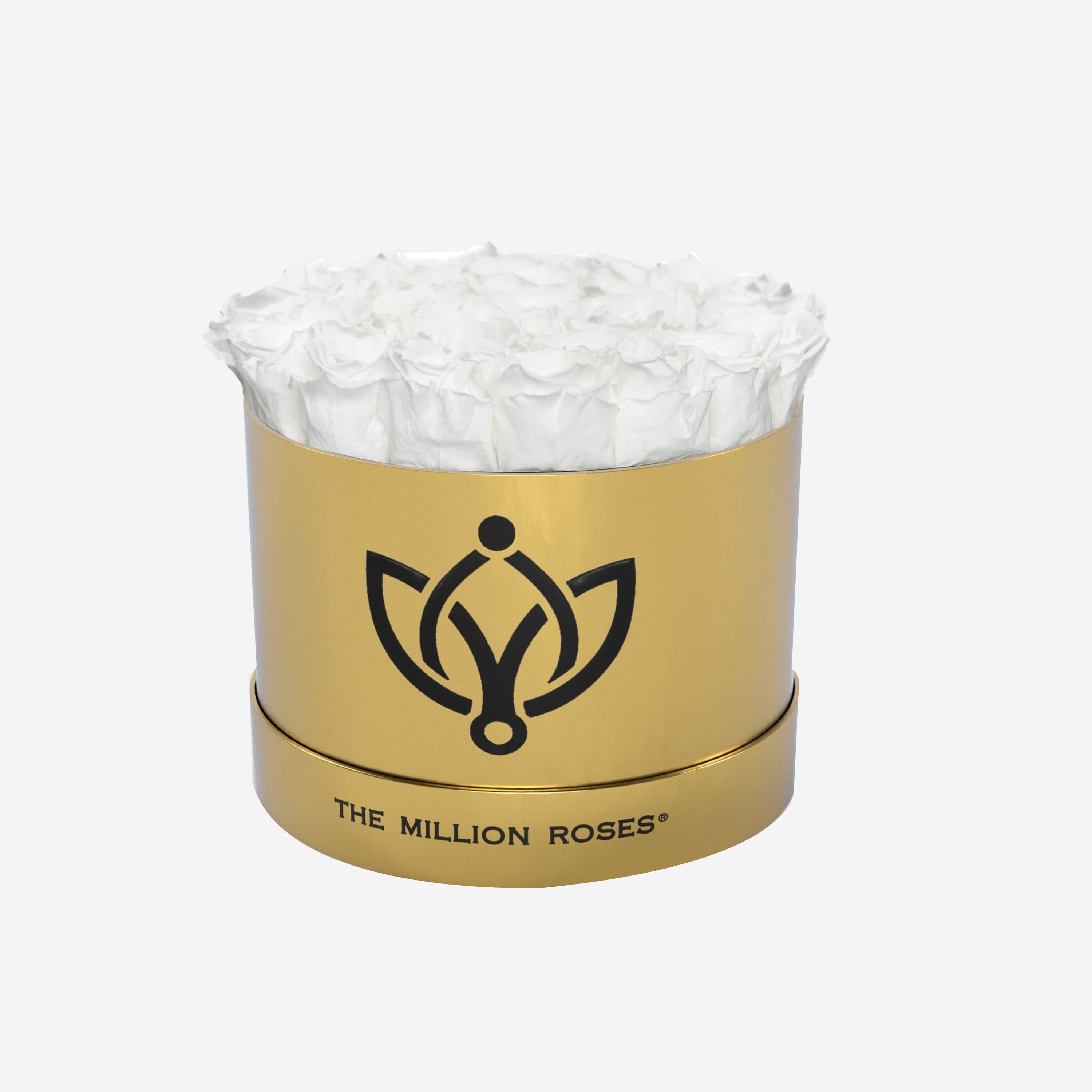 Our Classic collection embodies this stylish simplicity in a gold box filled with white long-lasting roses.