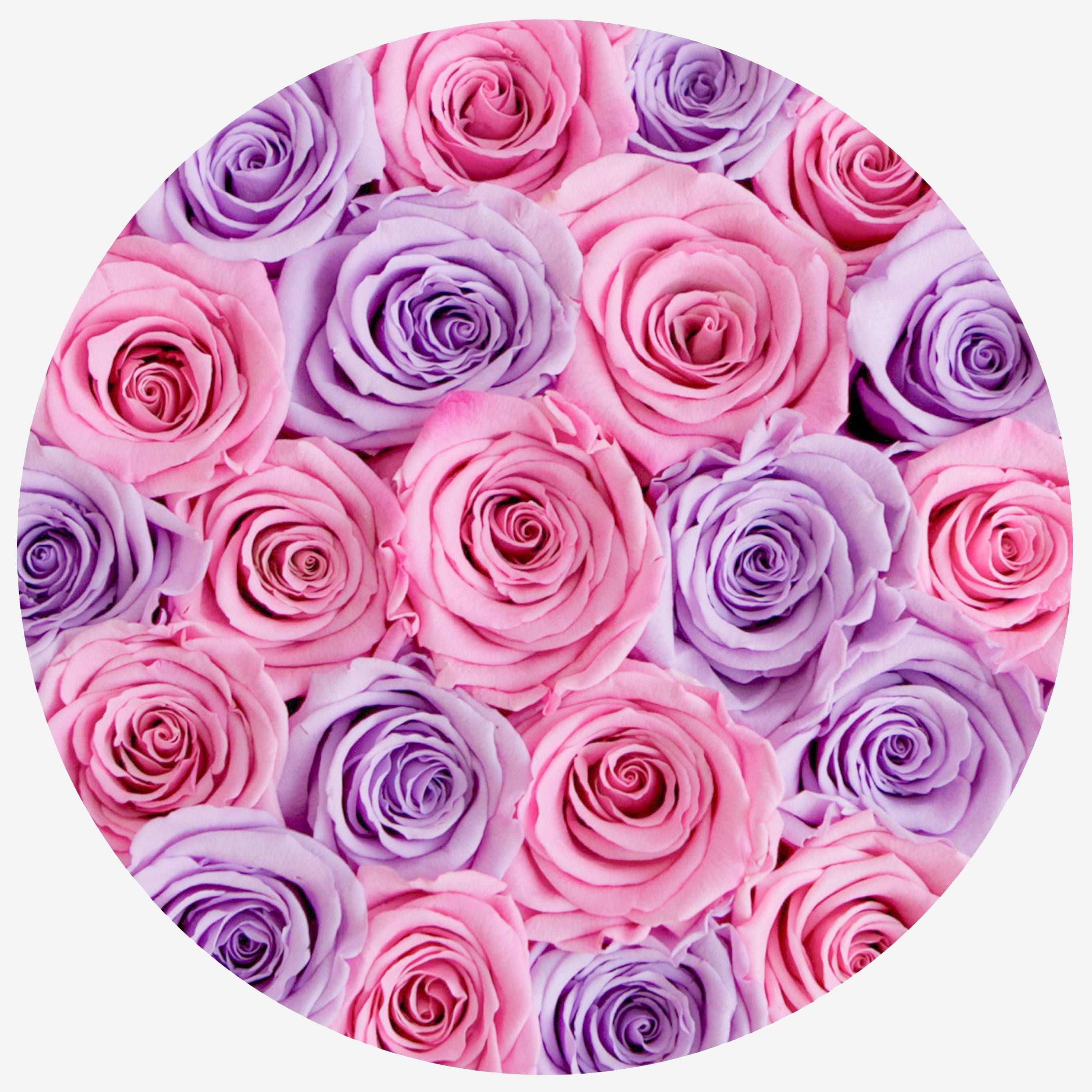 Our Classic collection embodies this stylish simplicity in a white box filled with lavender and pink candy long-lasting roses.