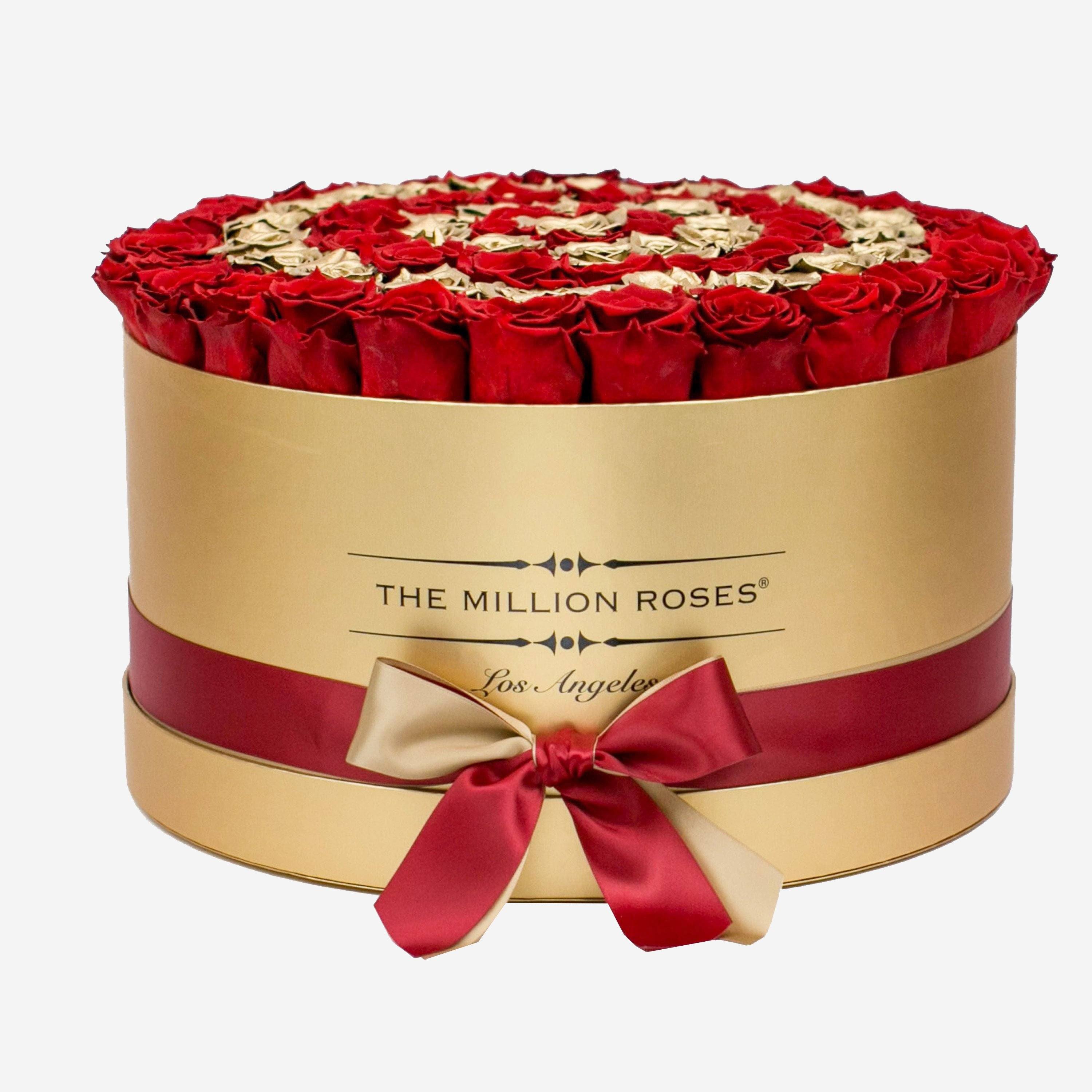 The red and gold roses in our The Million Roses Deluxe arrangements come in hand-crafted gold box and are as well-preserved as they are showstopping.