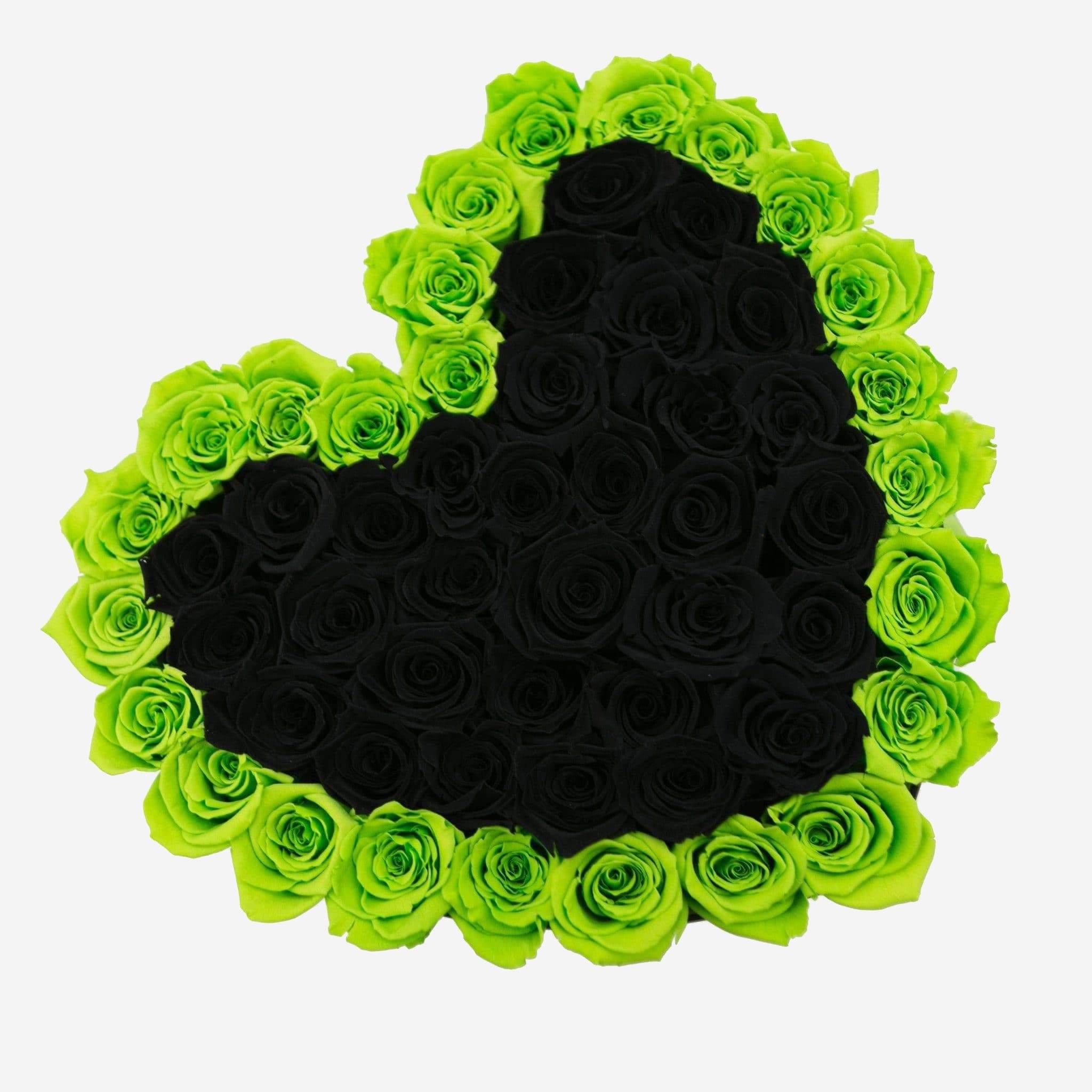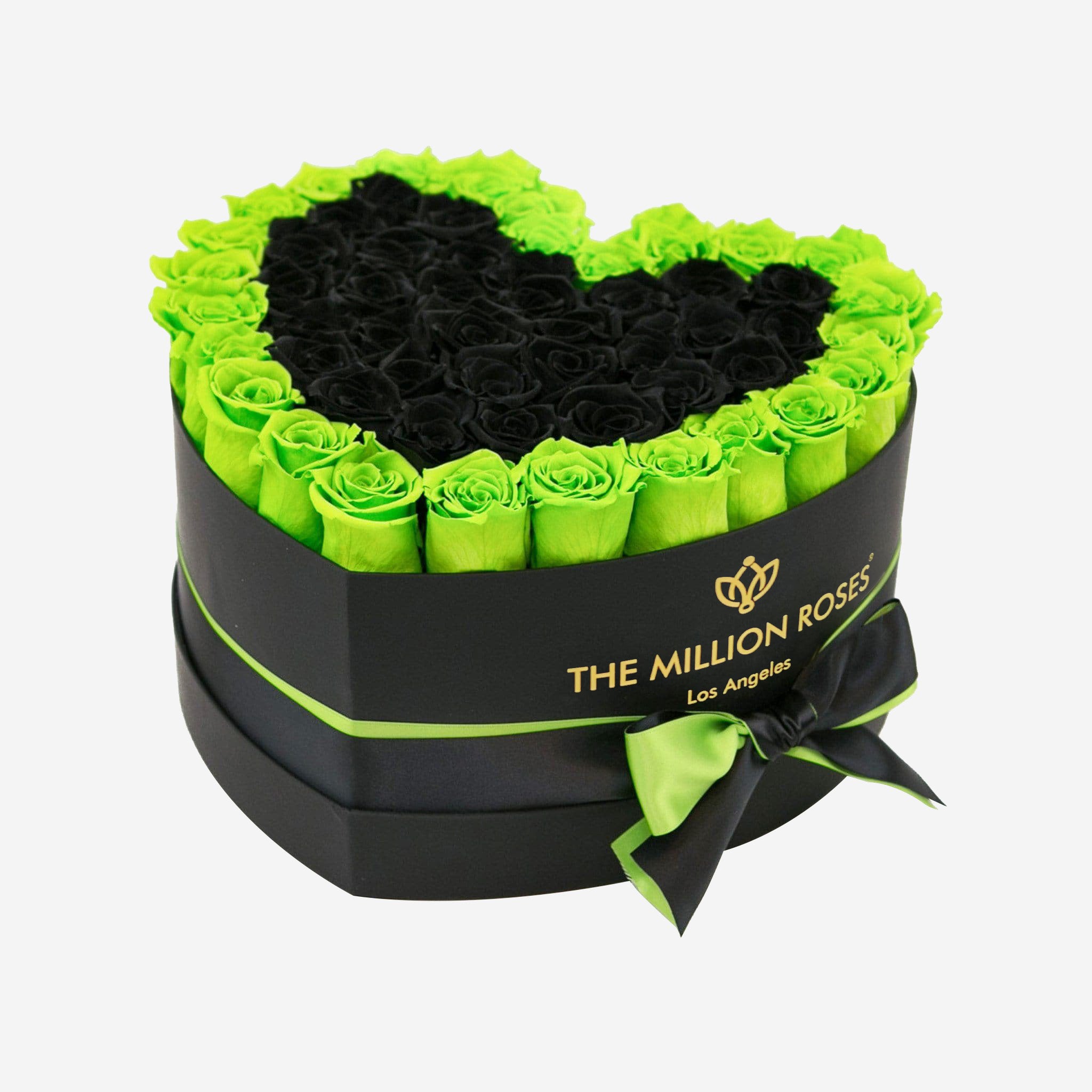 Our Heart collection features neon green and black roses in our hand-crafted black heart-shaped box. Theres no better gift for Valentines Day, a birthday, an anniversary, or just because.