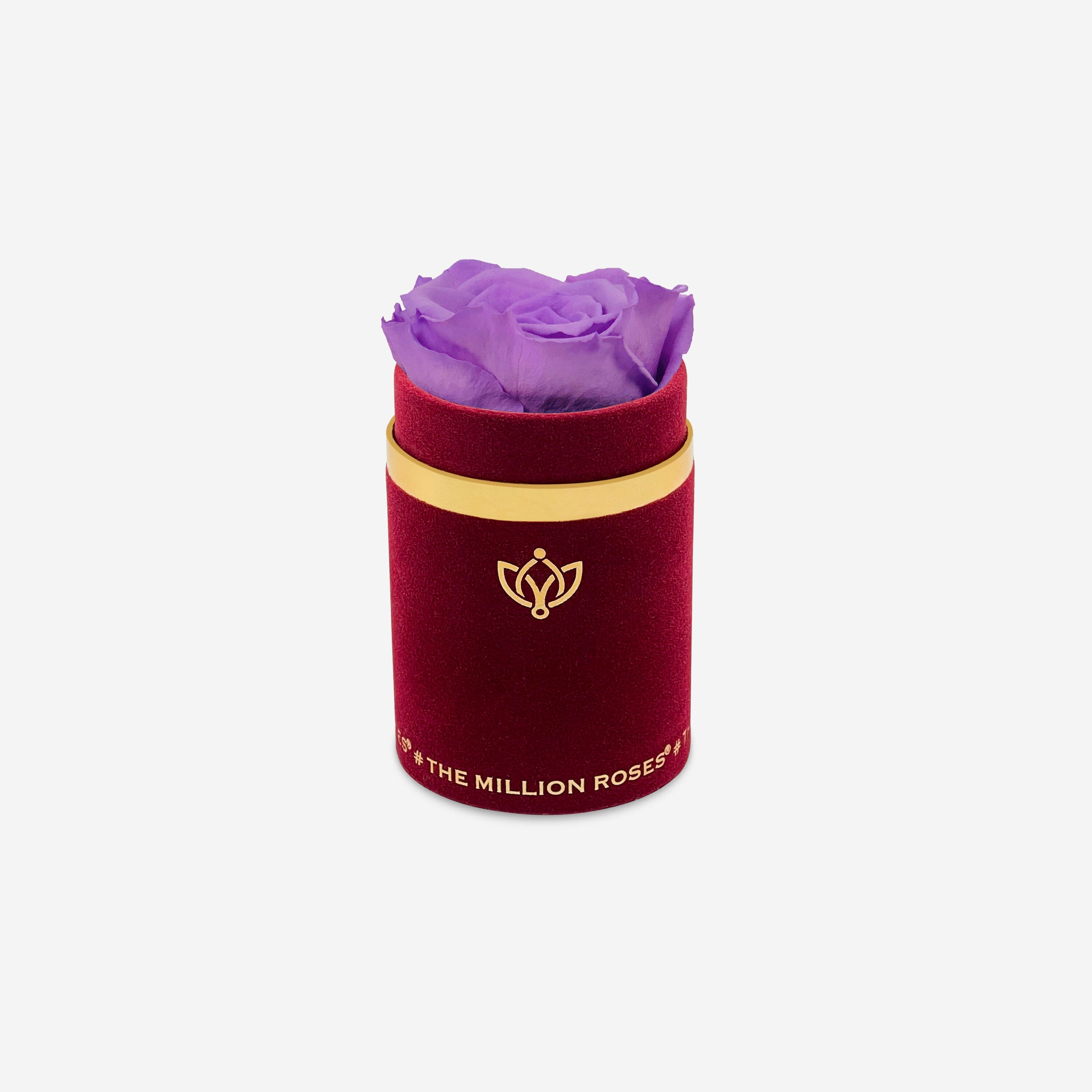 One rose says it all in this bordeaux suede box adorned with a gorgeous and long-lasting lavender rose.