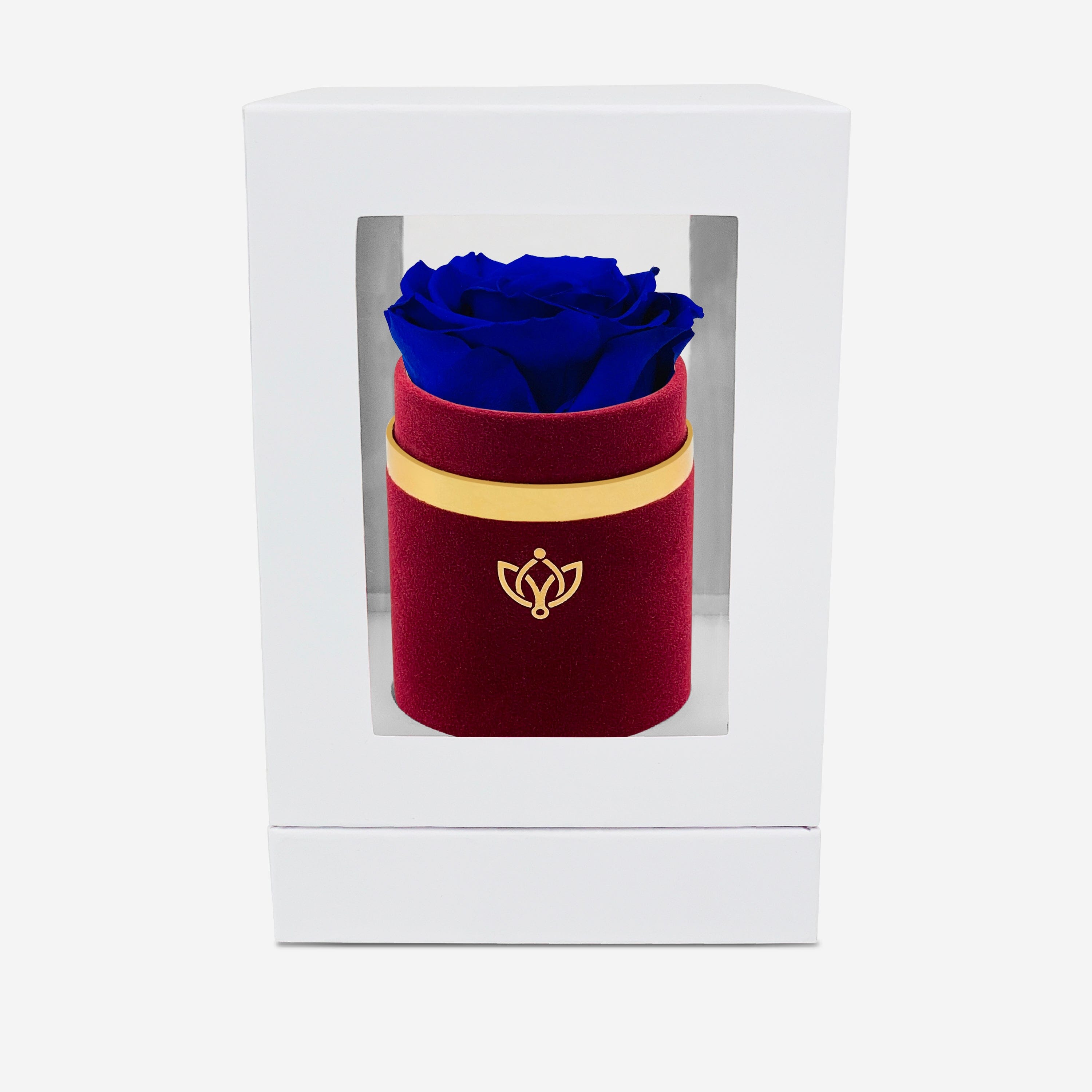 One rose says it all in this bordeaux suede box adorned with a gorgeous and long-lasting royal blue rose.