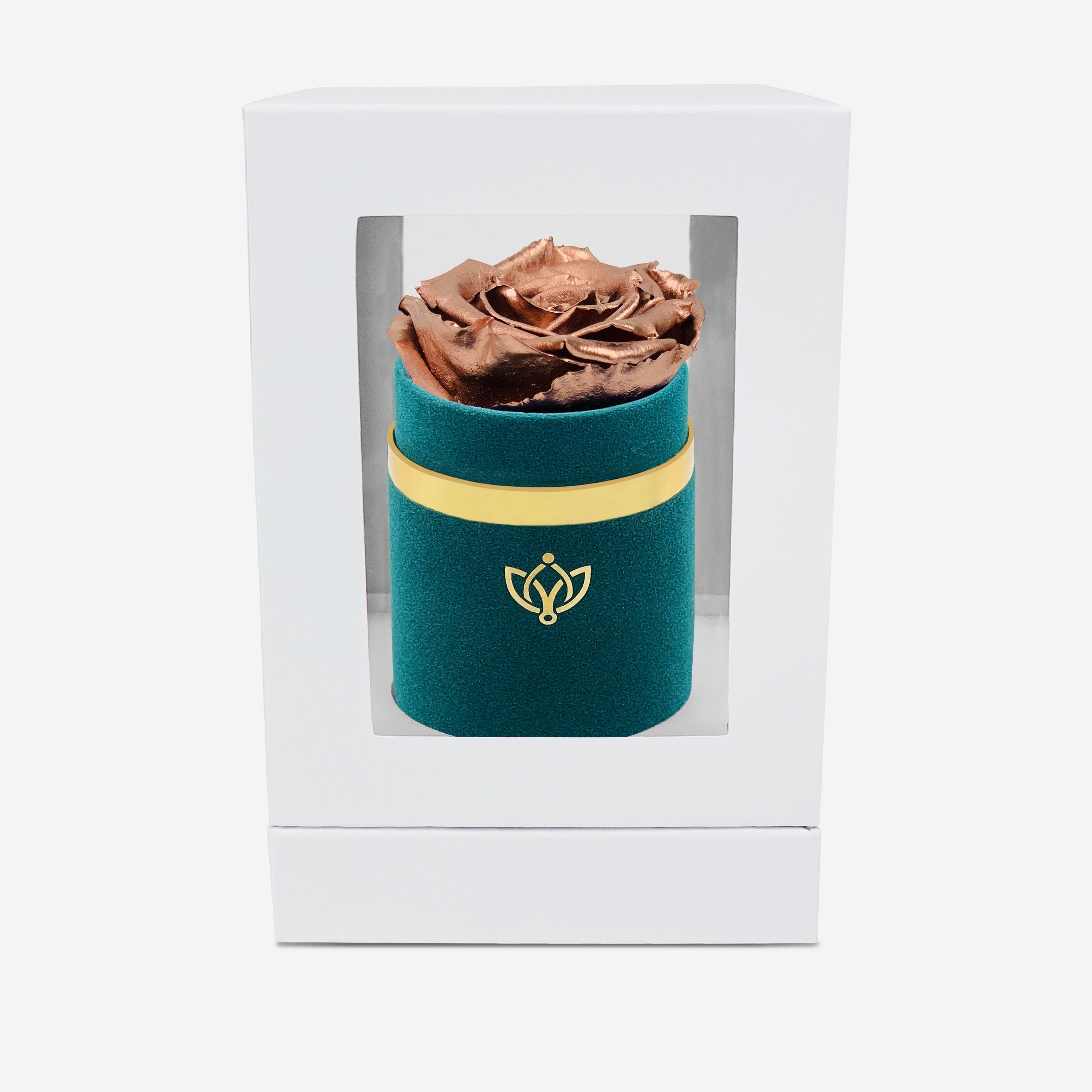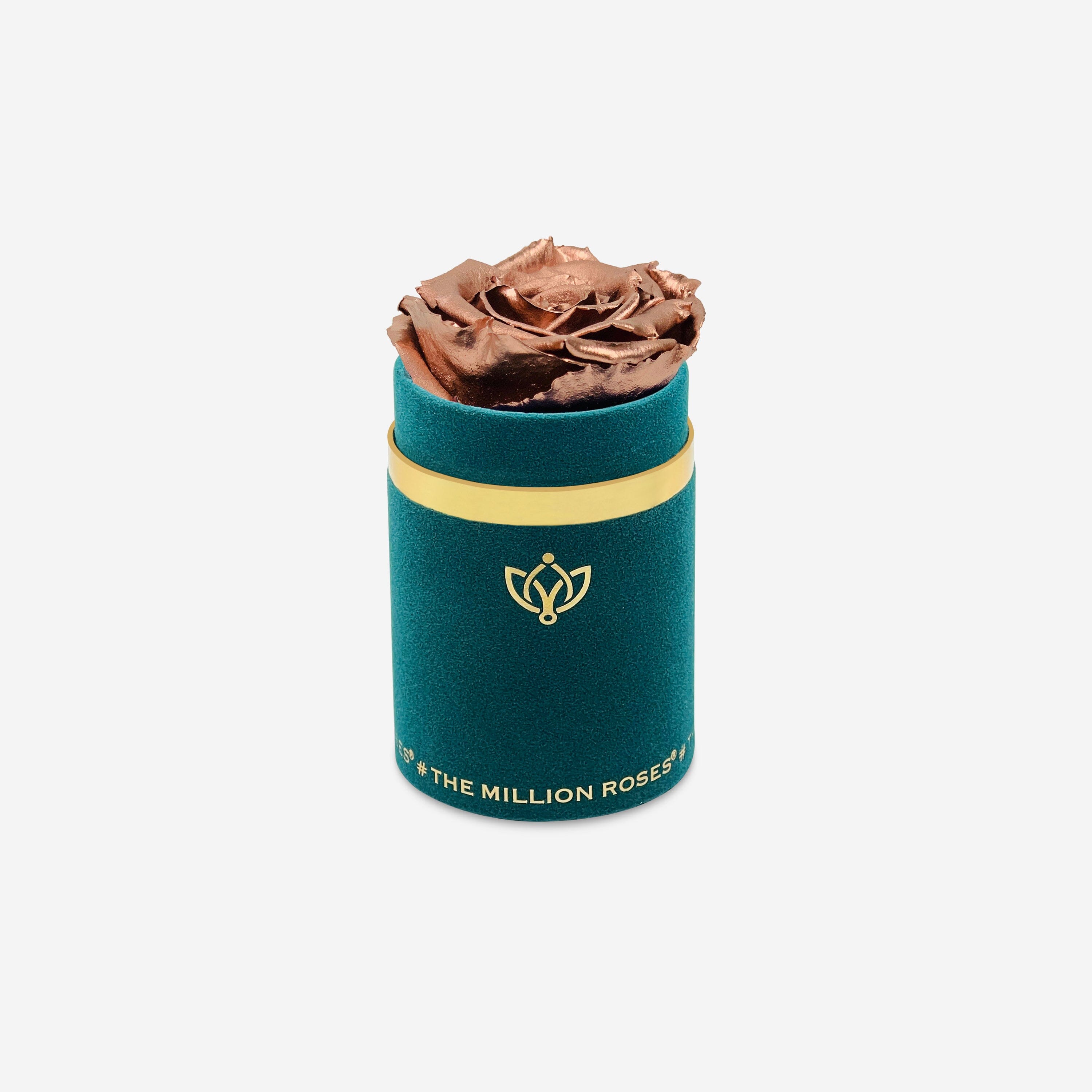 One rose says it all in this dark green suede box adorned with a gorgeous and long-lasting rose gold rose.