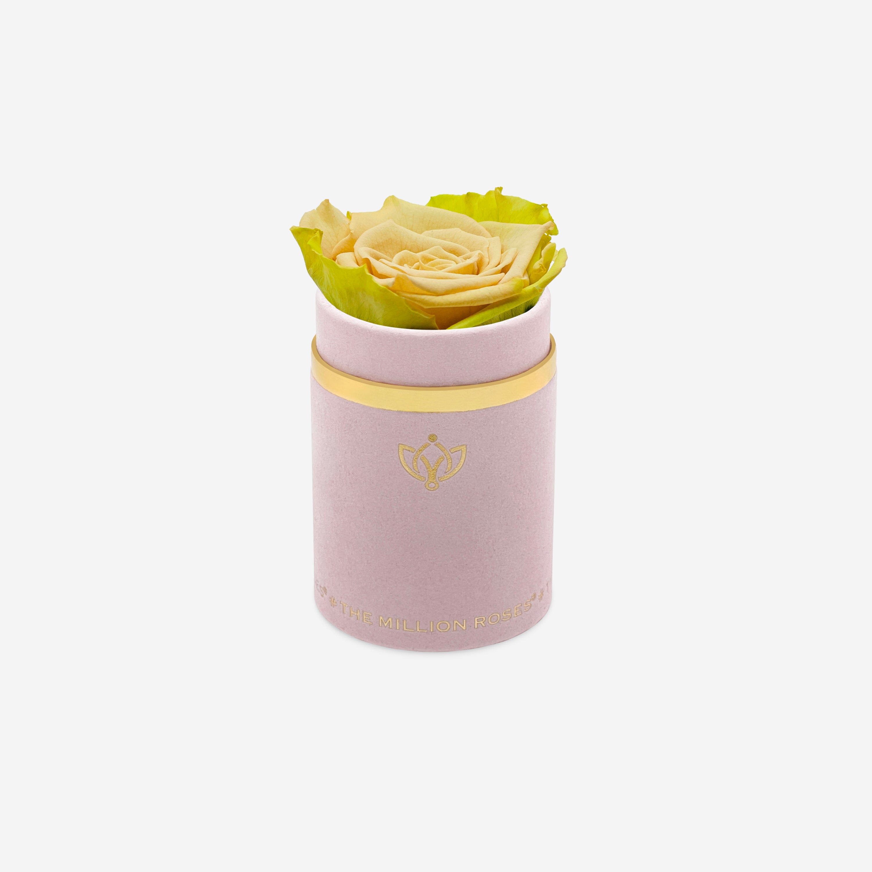 One rose says it all in this light pink suede box adorned with a gorgeous and long-lasting fawn bicolor rose.