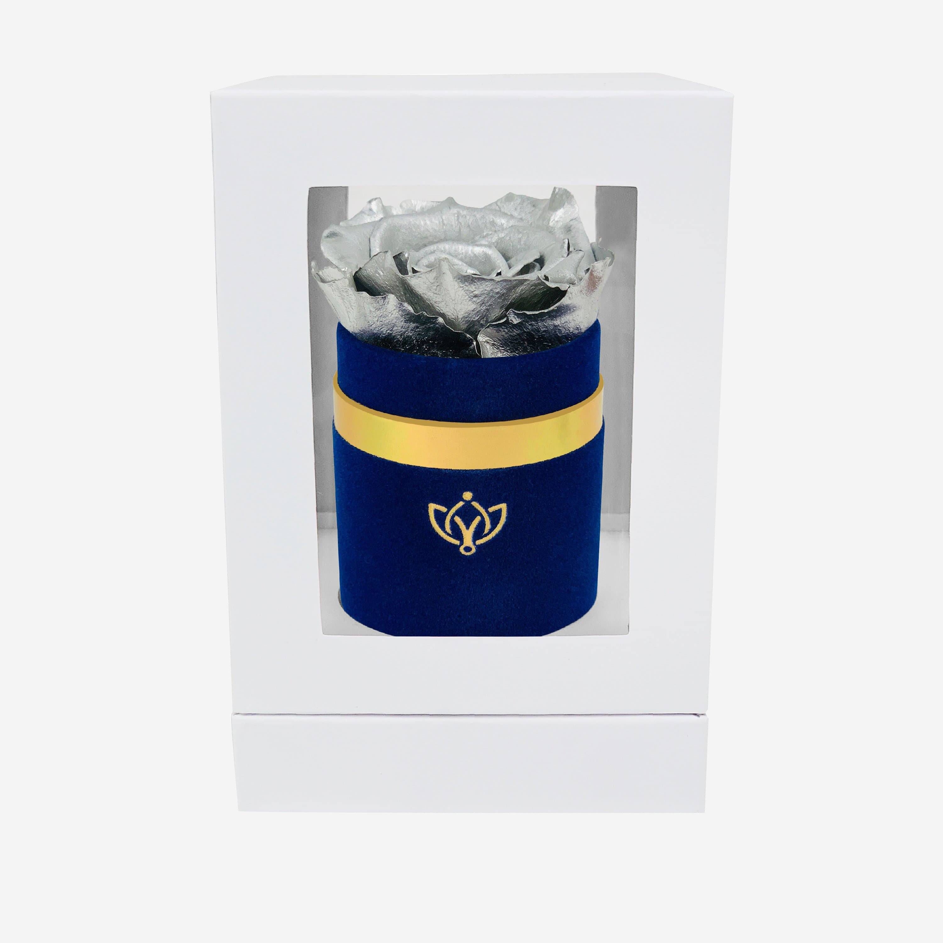 One rose says it all in this royal blue suede box adorned with a gorgeous and long-lasting silver rose.