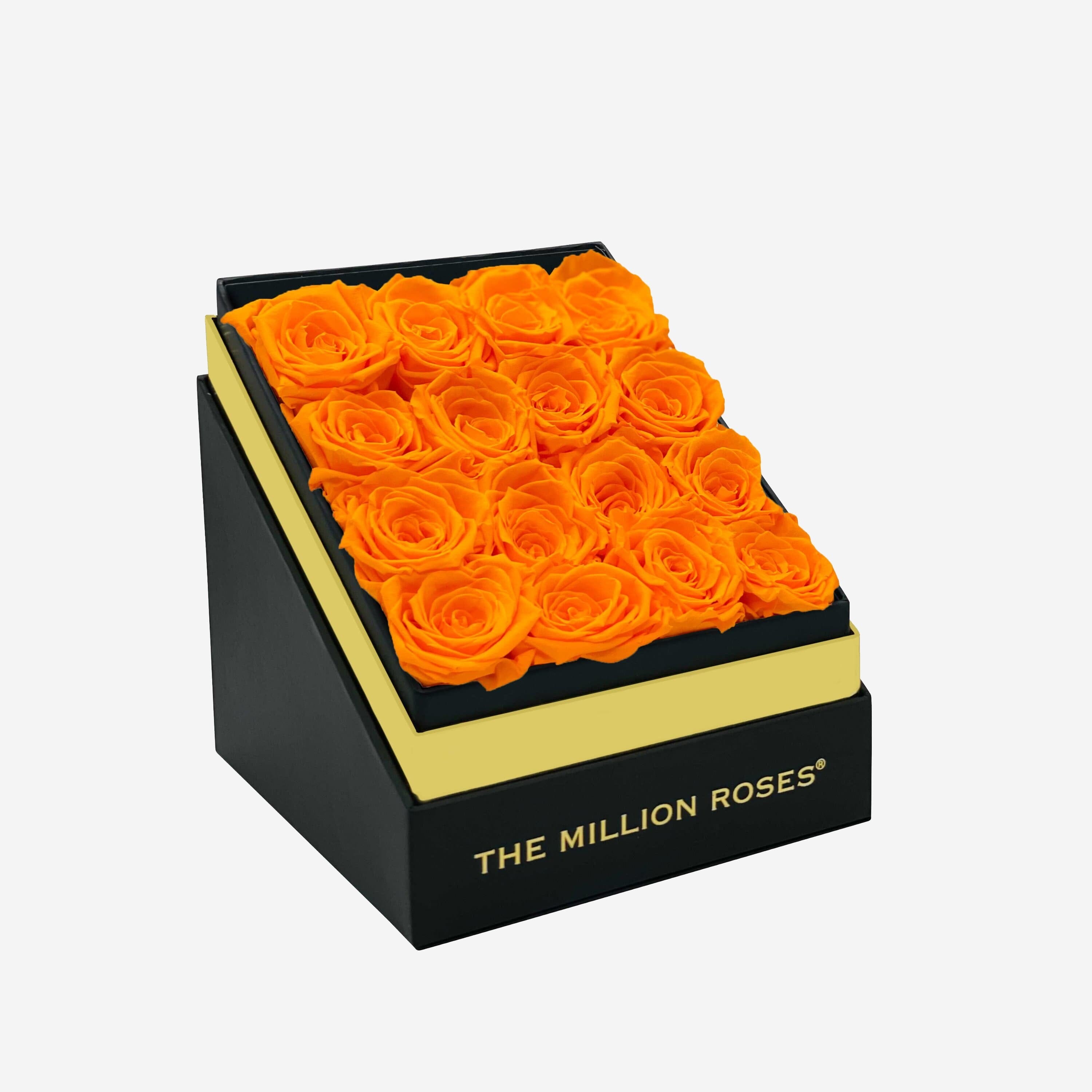 Our Square Collection gets a whole new look in this unique black box filled with orange roses.