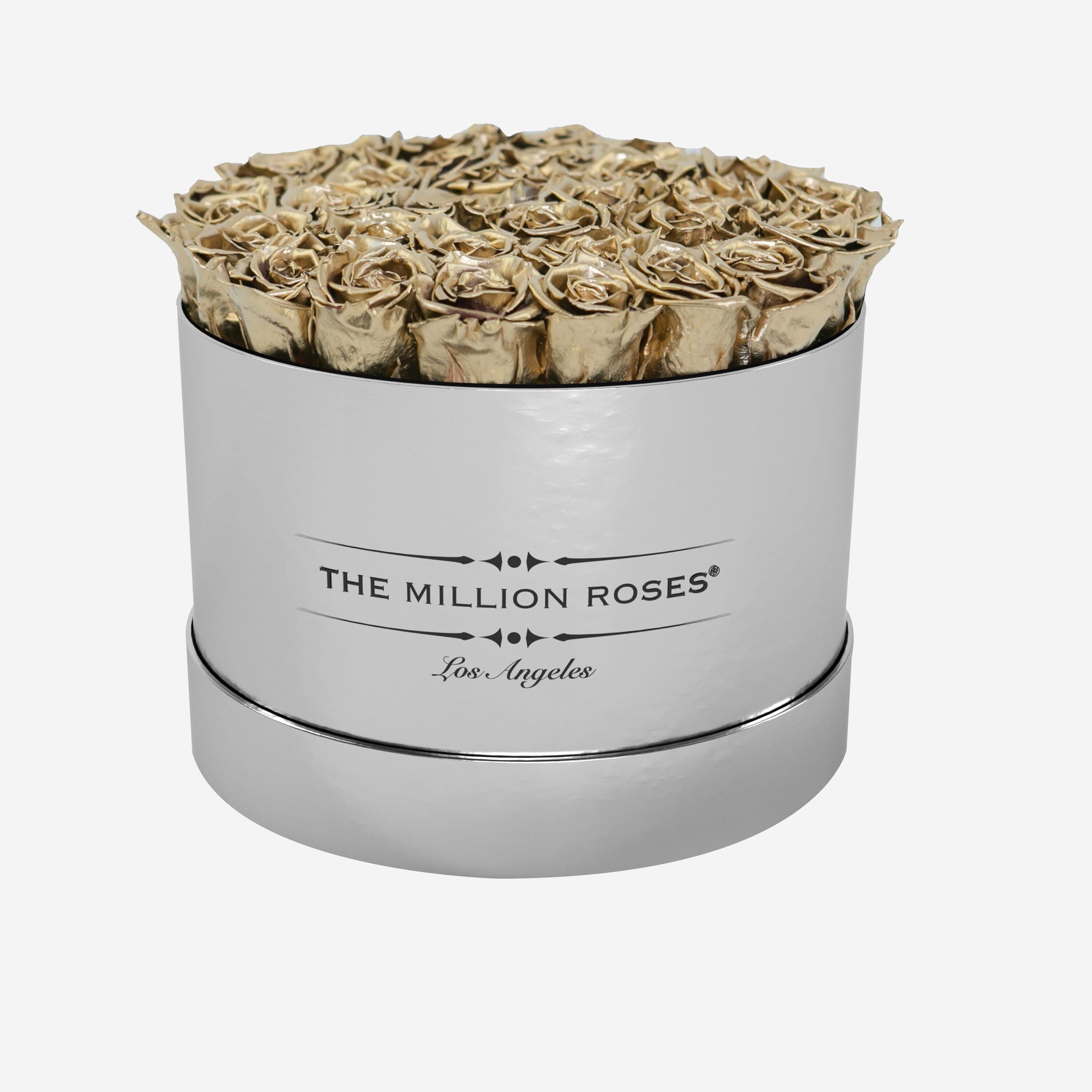 The arrangement showcases gold preserved roses with an outstanding natural appearance in one of our incredible hand-crafted mirror silver boxes.